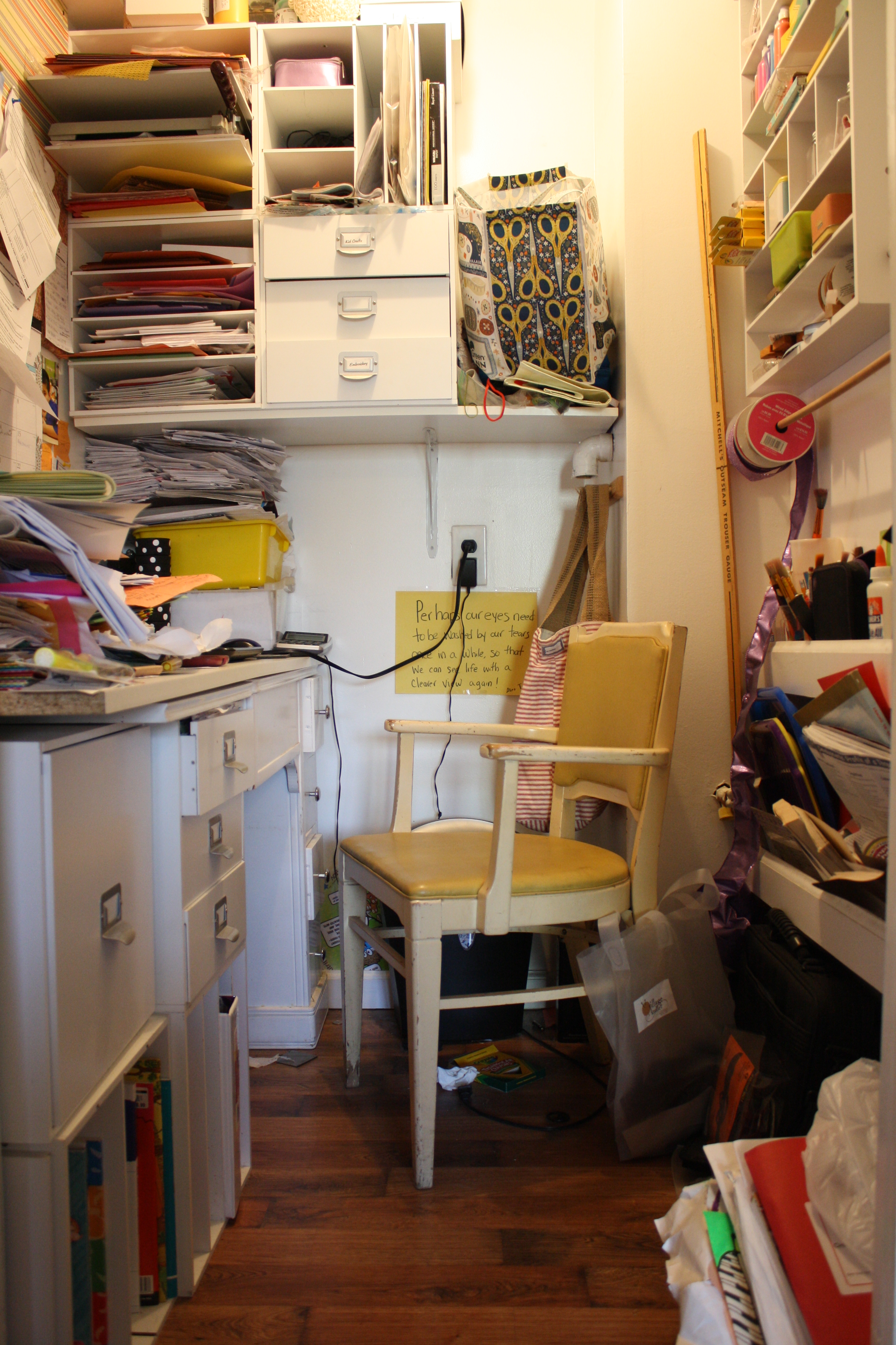 This is where I spend most of time during the work week.  It is my work office, my family office, my craft supply room and library squeezed into this tiny 5’x4′ room so organization is key for functionality.  Being the visual person that I am, I will start by making a list of all things in this hideaway that need a home.  Pencils, paper, bills, books, knitting needles, paint, and pictures will need somewhere to hide.  Let’s begin!